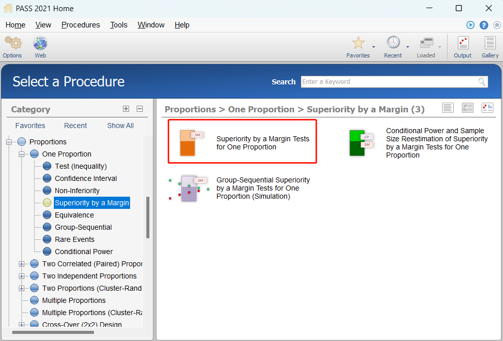 先在左边栏Category选择“Procedures (程序)”—“Proportions (比例)”—“One Proportion (单样本比例)”—“Superiority by a Margin Tests (优效检验)”。
