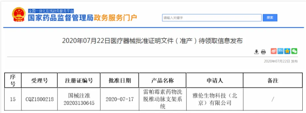 雅伦生物雷帕霉素药物洗脱椎动脉支架系统获批上市!