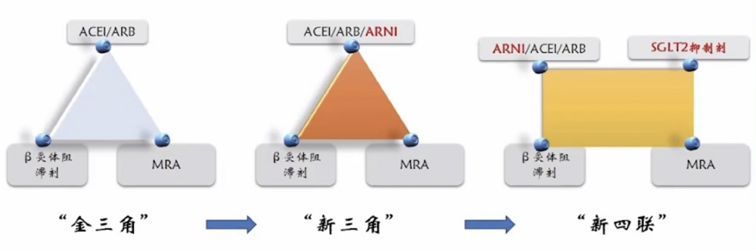 血管紧张素受体脑啡肽酶抑制剂(ARNI)或血管紧张素转换酶抑制剂(ACEI)/血管紧张素Ⅱ受体拮抗剂(ARB)、钠-葡萄糖共转运蛋白2抑制剂(SGLT2i)、β受体阻滞剂和盐皮质激素受体拮抗剂(MRA)为基础的“新四联 ”规范化心衰药物治疗模式,能够大幅度改善射血分数降低的心衰患者预后。而SGLT2i和ARNI能够显著改善射血分数保留的心衰患者预后。
