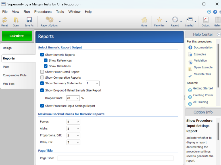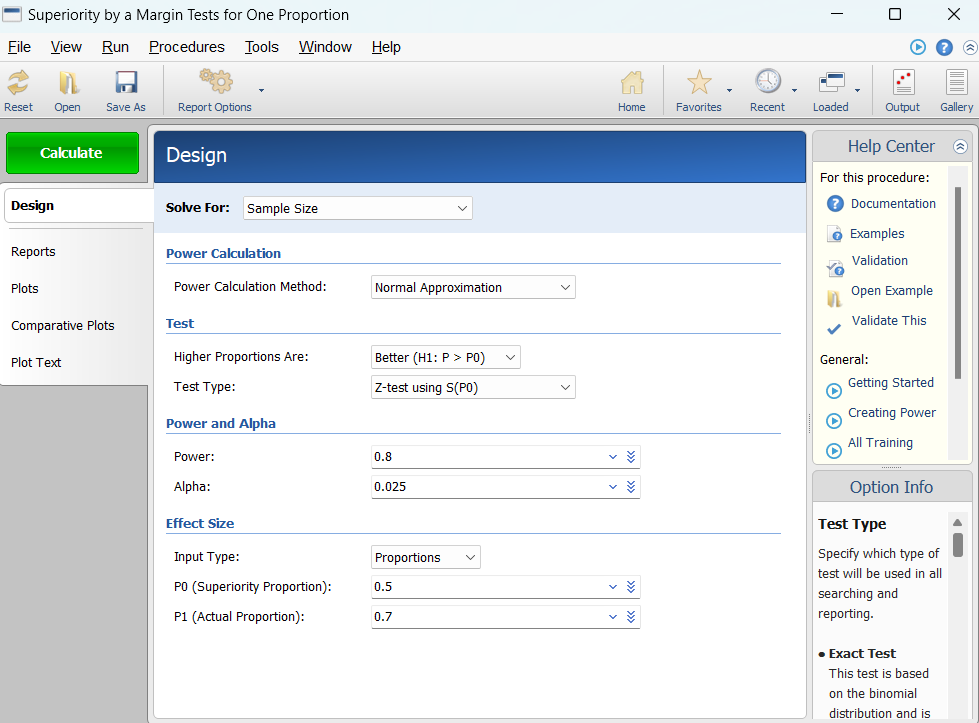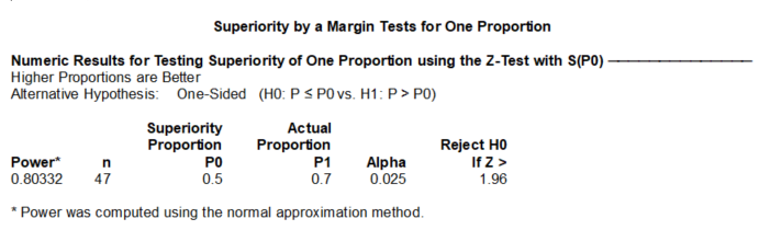 P0 (Superiority Proportion): 参考值,也就是优效性cutoff值。对于高优指标来说,高于这个值的结果即被考虑为优效,本例中传统方法的有效率为50%,试验为了证明新方法高于传统方法,故此处填写“0.5”。